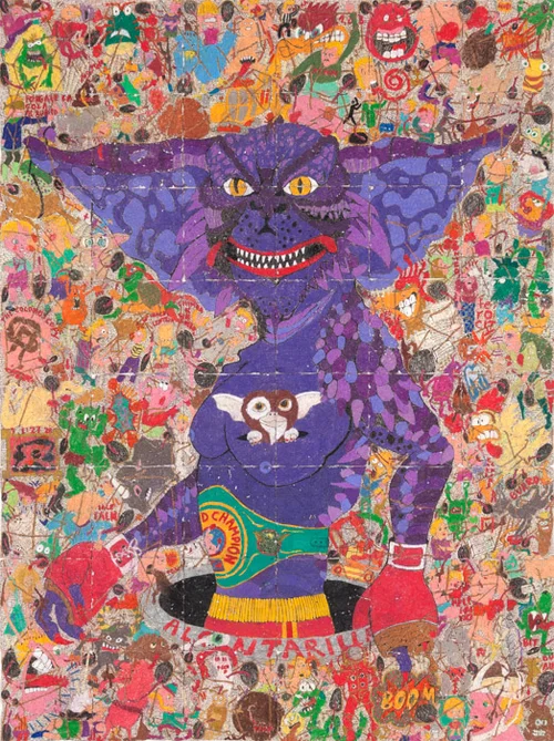 Ink, water soluble wax pastels, tape, glue, newspaper clippings and saliva on paper. 2012 - 2019
